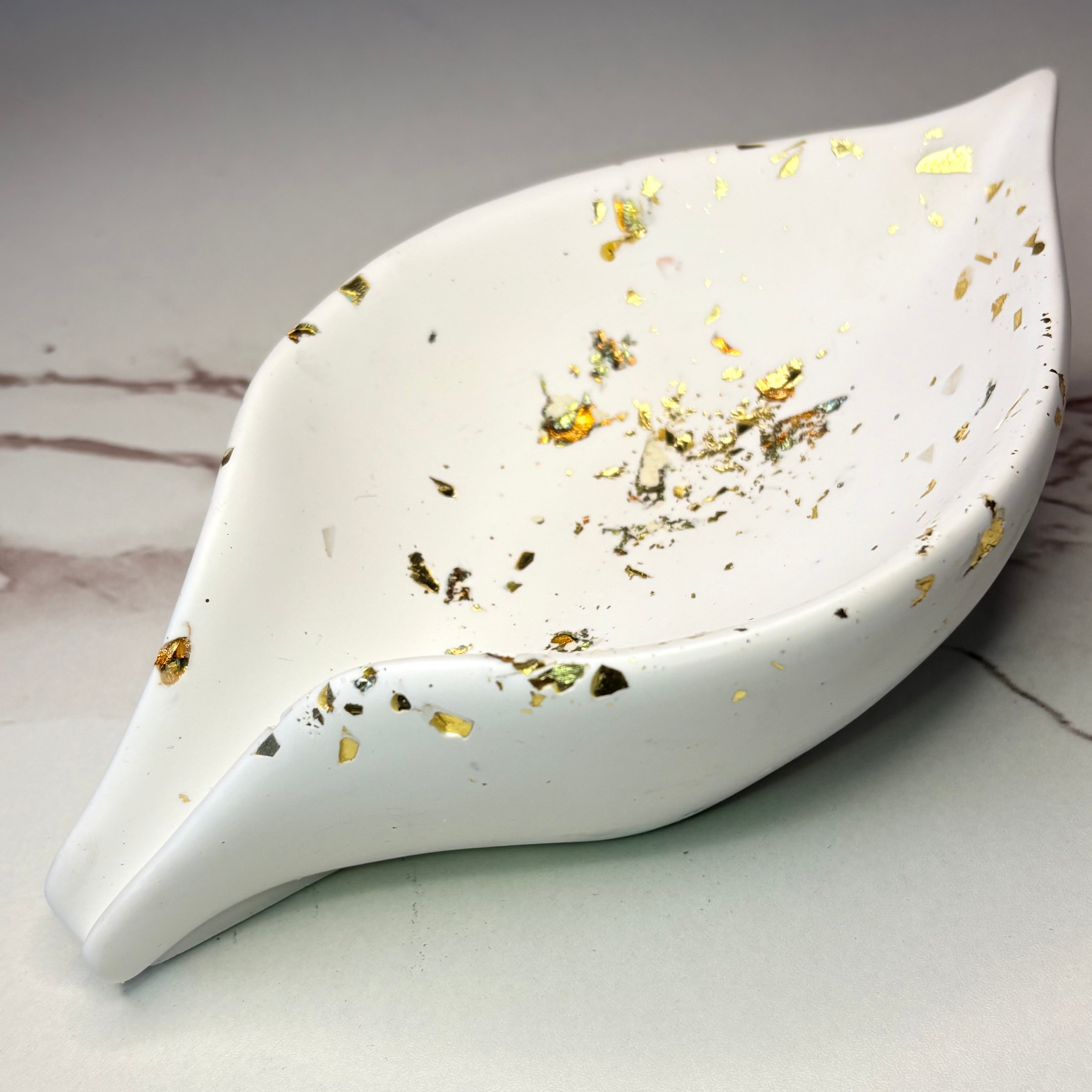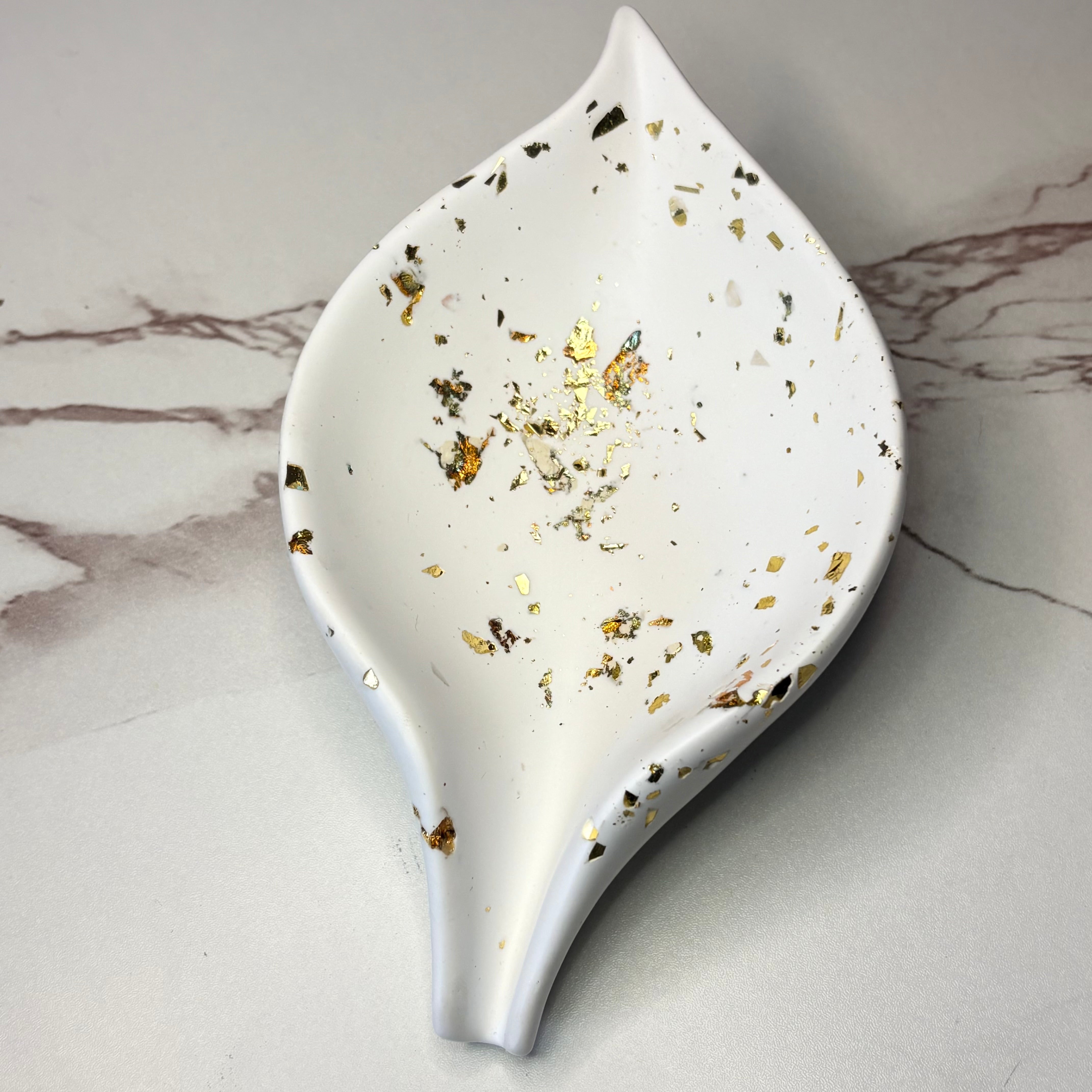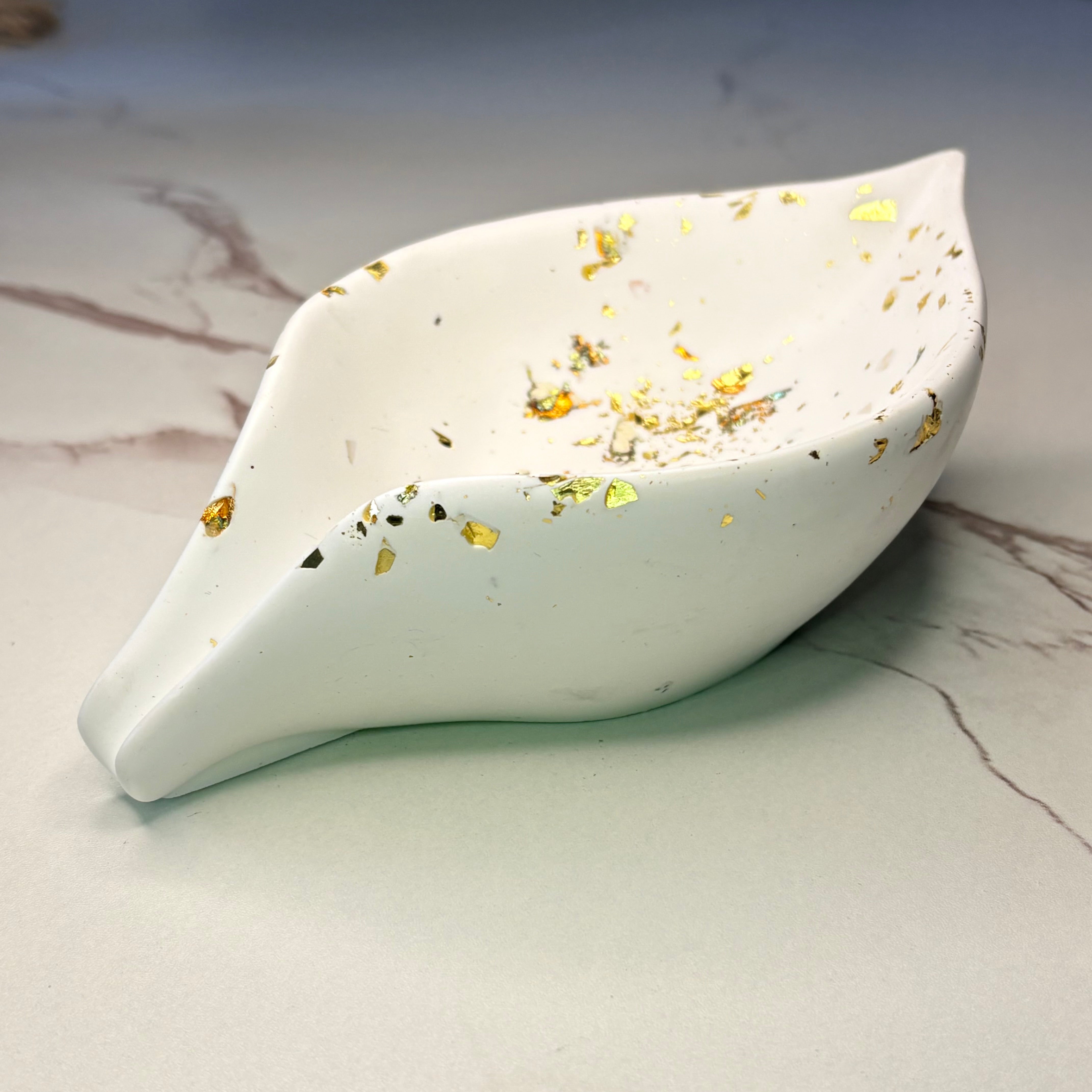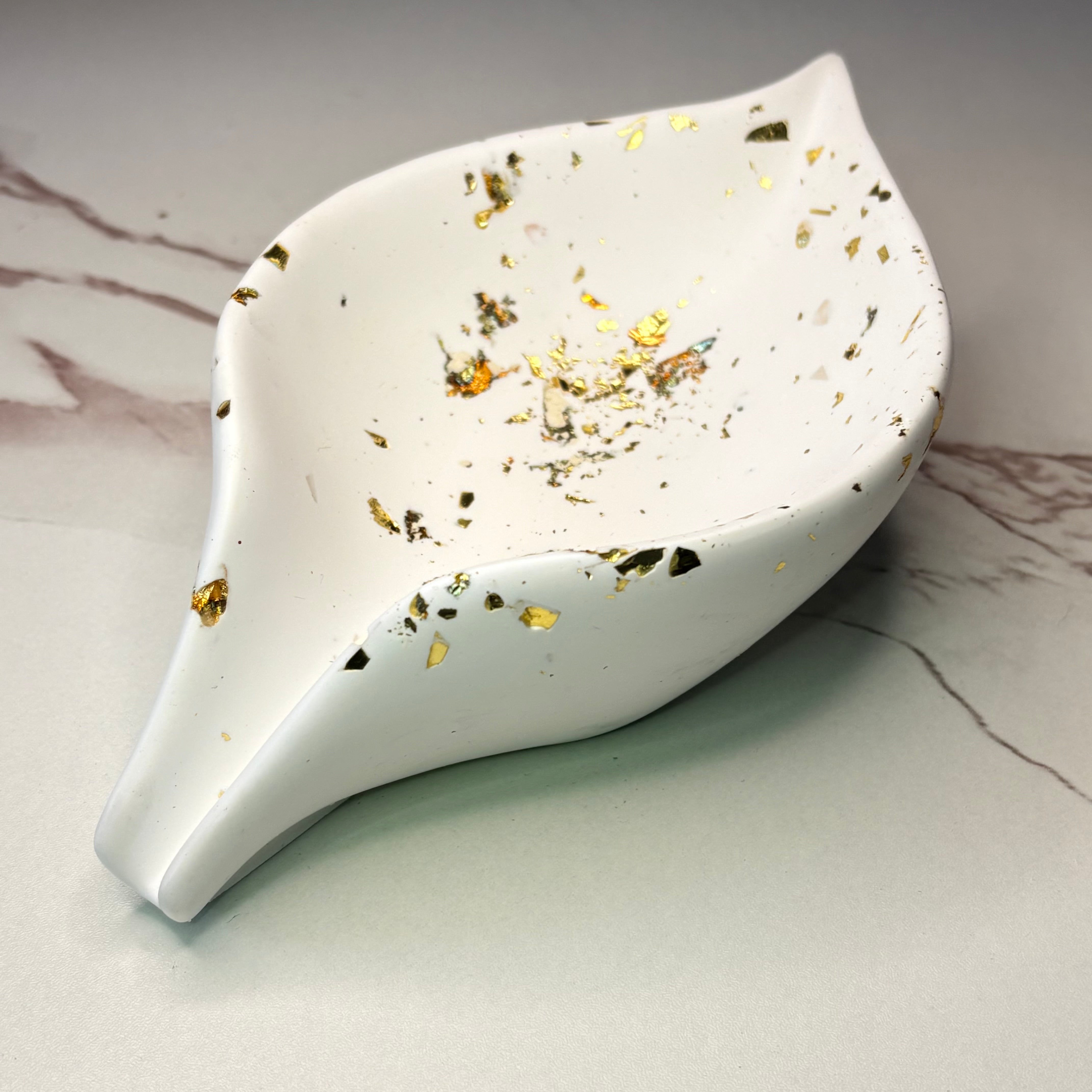 Handmade Leaf Soap Dish with Drainage Spout available in Grey or White with Gold Specks