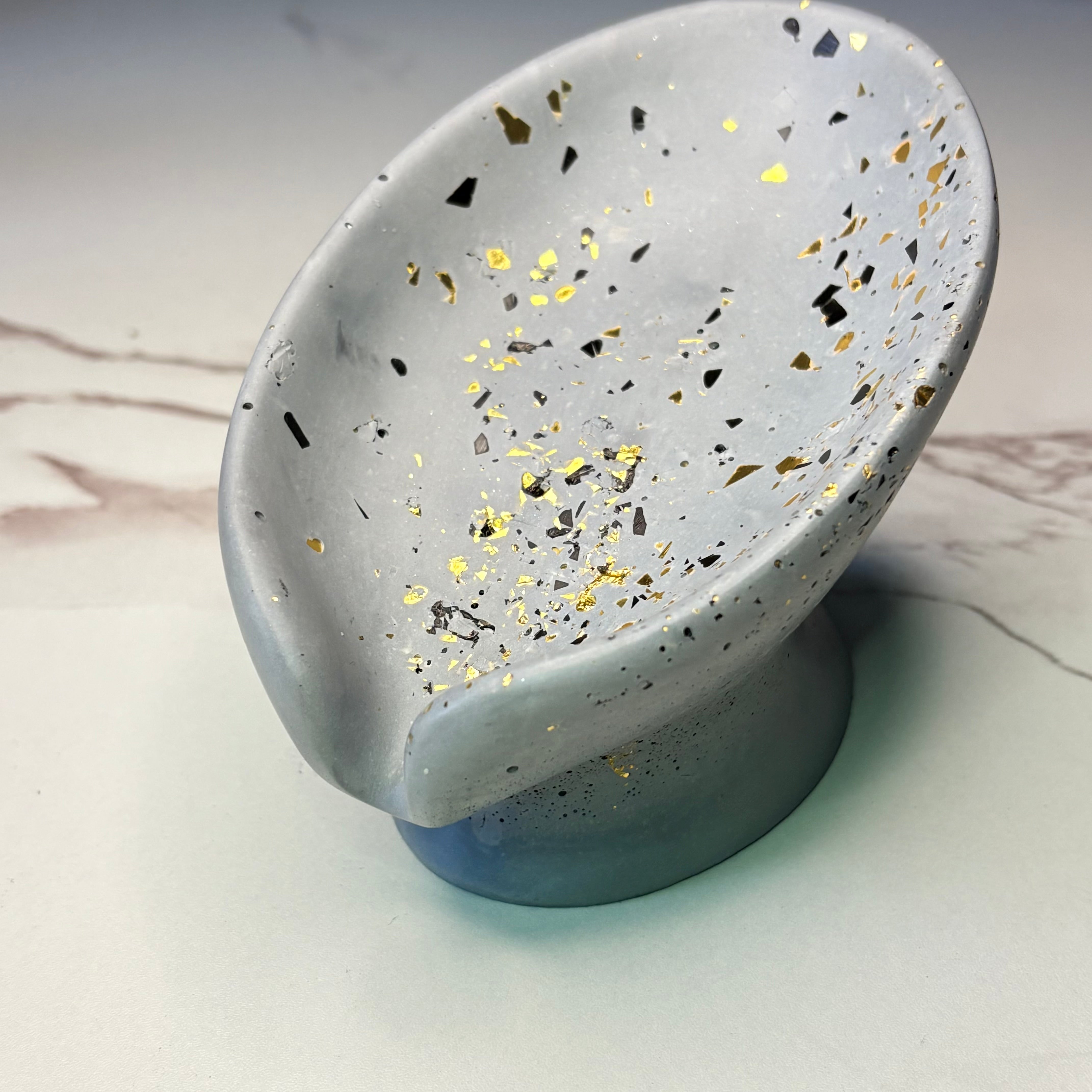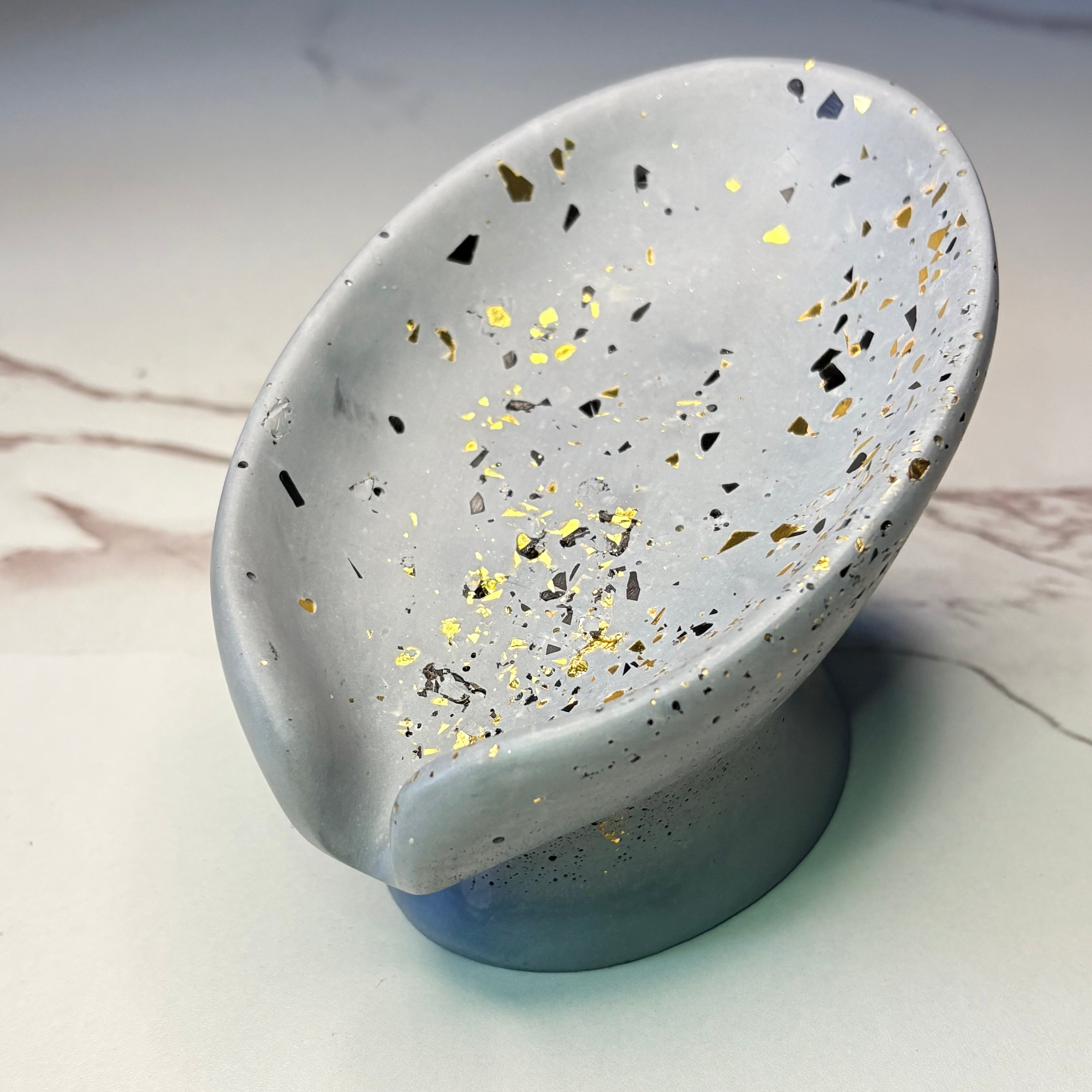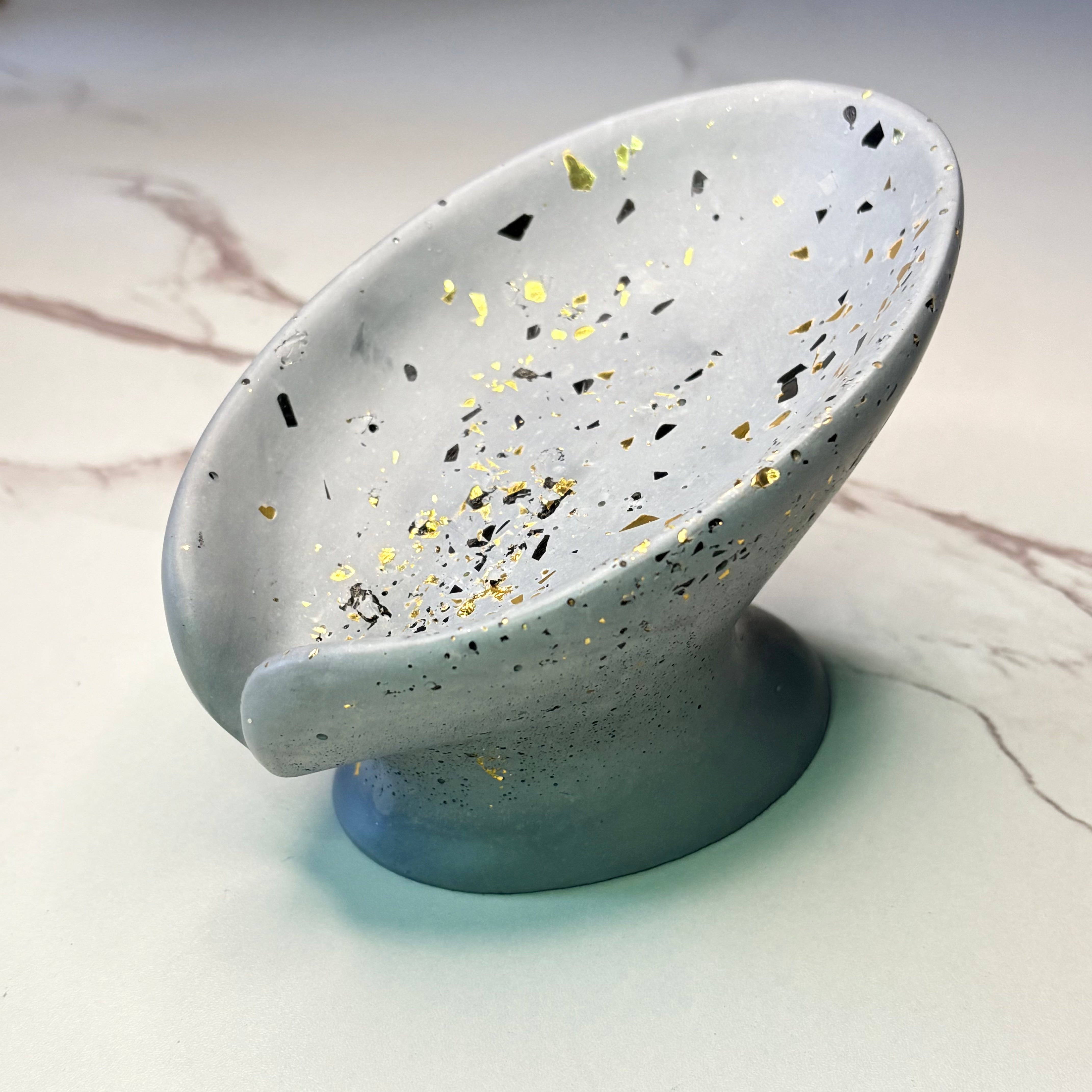 Handmade Tilted Oval Soap Dish on Stand. Available in Grey or White with Gold Specks